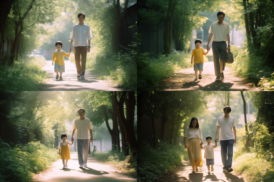 Midjourney Bot 更新时间:2023-09-04 13:18On a brilliant summer afternoon, the sunlight sprinkled among the dense leaves, forming a mottled light and shadow that danced on the shady path. Dad is tall and burly, with firm eyes. He holds his mother's soft and warm hand, demonstrating endless strength and care; My mother is elegant and gentle, with a bright smile and the power and tenderness of maternal love in her eyes. And the young son tightly held their hands, his eyes filled with curiosity and anticipation. On both sides of the path, blooming flowers vie to bloom, emitting a charming fragrance, like strings of colorful jewelry embellishing this beautiful passage. A gentle breeze caressed the three people's hair, bringing a fresh breath and a sense of tranquility. Their steps are even, as if they are integrated with the surrounding natural scenery, together composing the strong emotions and unwavering perseverance between families.,delicate skin texture,UHD,Best quality,photorealistic,cinematic style,morning light,Full body --ar 1:1 --style expressive --niji 5