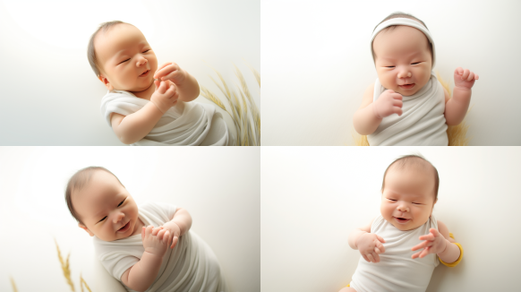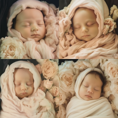 Midjourney Bot 更新时间:2023-09-04 13:08A newborn Chinese baby, eyes closed, white skin, rosy face, white swaddling clothes, surrounded by dreamy rose flowers, with some light coming in from the side against a dreamy white background. The composition is beautiful, rich, and bright. --ar 1:1 --style raw --v 5.2 --s 250
