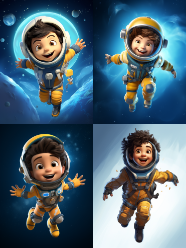 Midjourney Bot 更新时间:2023-09-04 13:19A cartoon style astronaut, an eight year old boy, Wearing a blue spacesuit. Wearing an aerospace helmet, his eyes sparkled with curiosity and courage. His hair is yellow. The little boy's face was filled with a pure smile,,,studio light,Best quality,disney,full body character design,excited,clean background --ar 3:4 --style raw --v 5.2