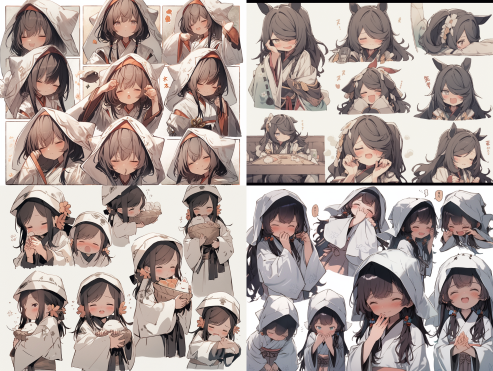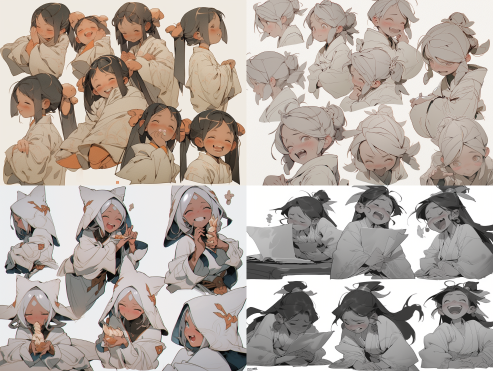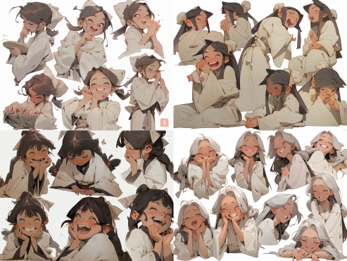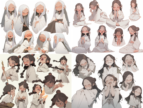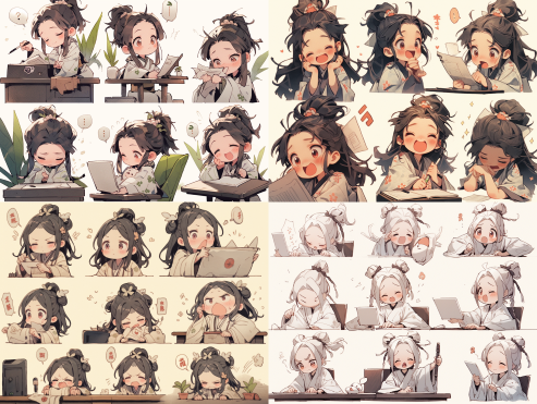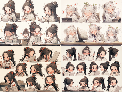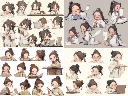 Midjourney Bot 更新时间:2023-09-04 12:18A little girl in a white robe reads, traditional clothes, animated character design, Chinese painting, light gray, cute, modest charm, emoticon package, 9 emoticons, emoticon Symbol table, multiple postures and expressions, anthropomorphic style, black strokes, different emotions, multiple poss and expressions, 8k --s 1000 --ar 4:3 --style expressive --niji 5