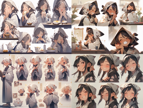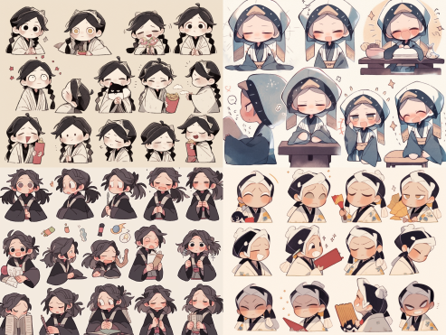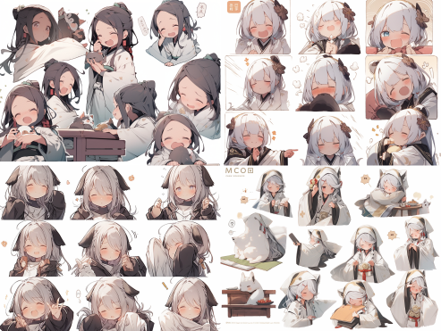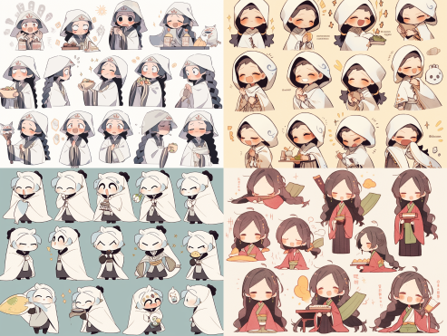 Midjourney Bot 更新时间:2023-09-04 12:20A little girl in a white robe reads, traditional clothes, animated character design, Chinese painting, light gray, cute, modest charm, emoticon package, 9 emoticons, emoticon Symbol table, multiple postures and expressions, anthropomorphic style, black strokes, different emotions, multiple poss and expressions, 8k --s 456 --ar 4:3 --style expressive --niji 5