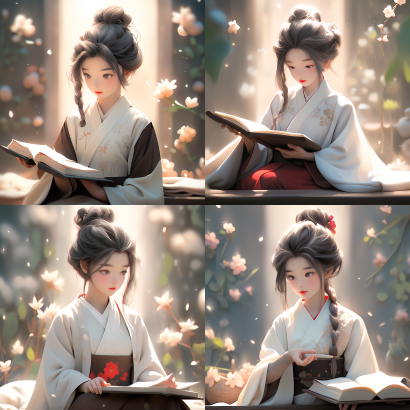 Midjourney Bot 更新时间:2023-09-04 12:221girl, solo, book, braid, flower, black hair, open book, blurry background, blurry, long hair, red lips, hair ornament, reading, hair bun, upper body, single hair bun, chinese clothes, long sleeves, lips, hair flower, wide sleeves, white flower, realistic, single braid --iw 2 --ar 1:1 --niji 5