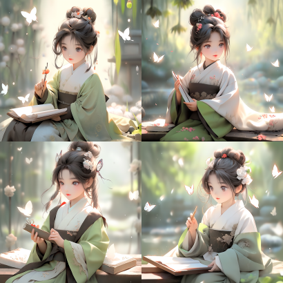 Midjourney Bot 更新时间:2023-09-04 12:241girl, bug, solo, butterfly, hair bun, hair ornament, holding, book, sitting, paper, chinese clothes, black hair, outdoors, long sleeves, sash, hanfu, day, closed mouth, wide sleeves, looking at viewer, japanese clothes, green kimono, flower, blurry, brown hair --iw 2 --ar 1:1 --niji 5