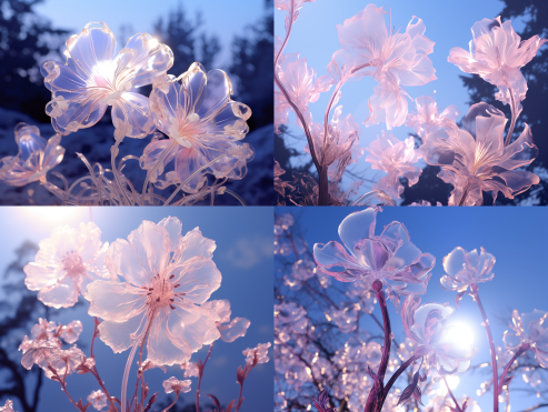 Midjourney Bot 更新时间:2023-09-04 12:34Digital flowers, iris flowers, roots composed of long and organic forms, frosted glass material, transparent plastic, backlit, flowers growing around, looking up, clean, sky, 3D art, C4D, super detailed --s 232 --c 12 --iw 0.5 --ar 4:3 --style raw --v 5.2