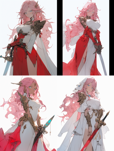 Midjourney Bot 更新时间:2023-09-04 12:29A woman with red dress, Light pink hair, Blue eyes, Armed with a sword, White translucent cloak, Ethereal characters, Charming anime characters, With ethereal illustrations --s 220 --iw 0.5 --ar 3:4 --style expressive --niji 5