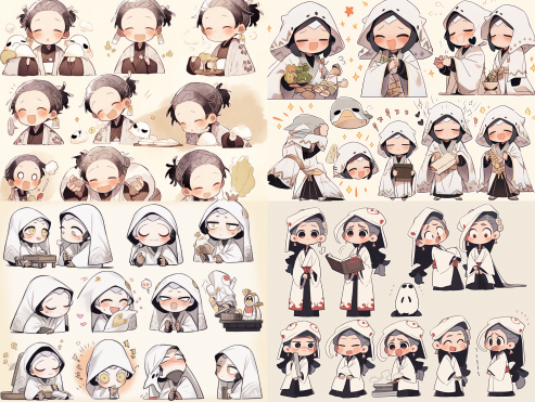 Midjourney Bot 更新时间:2023-09-04 12:20A little girl in a white robe reads, traditional clothes, animated character design, Chinese painting, light gray, cute, modest charm, emoticon package, 9 emoticons, emoticon Symbol table, multiple postures and expressions, anthropomorphic style, black strokes, different emotions, multiple poss and expressions, 8k --s 99 --ar 4:3 --style expressive --niji 5