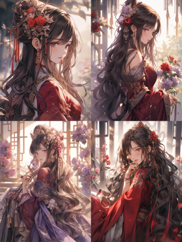 Midjourney Bot 更新时间:2023-09-04 12:19A beautiful woman from ancient China, dressed in Chinese Hanfu, deep purple clothes, flowing gauze, long hair, and gorgeous princess hair accessories, exudes a full temperament. The complex long skirt design, sunlight, clear face, exquisite clothing details, surrounded by deep red peonies, petal rain, mainly in purple, red, and yellow, facing the camera, full body, classical style, film shooting techniques, ultra high quality, 16K --s 685 --ar 3:4 --niji 5