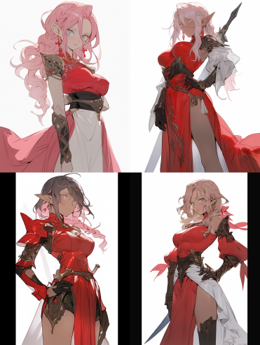Midjourney Bot 更新时间:2023-09-04 12:28A woman high elf with red princess Vest and red fish tail skirt::10, Light pink Wavy hair, Blue eyes, Armed with a rapier,translucent cloak, Ethereal characters, Charming anime characters, With ethereal illustrations ,Dungeons and Dragons::6 --s 150 --iw 0.5 --ar 3:4 --style expressive --niji 5