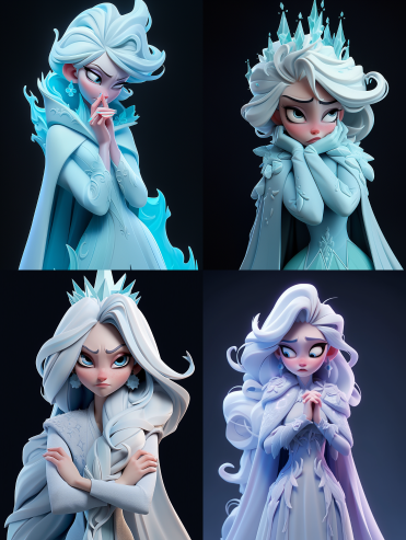 Midjourney Bot 更新时间:2023-09-04 12:23Animated cartoon characters dressed in Ice Queen clothing, with surreal detail style, contemplative posture, Molotov Otto's white haired Ice Queen Elsa, Zbrush style, cartoon scenes, 8k, emotional expression, --ar 3:4 --style expressive --niji 5