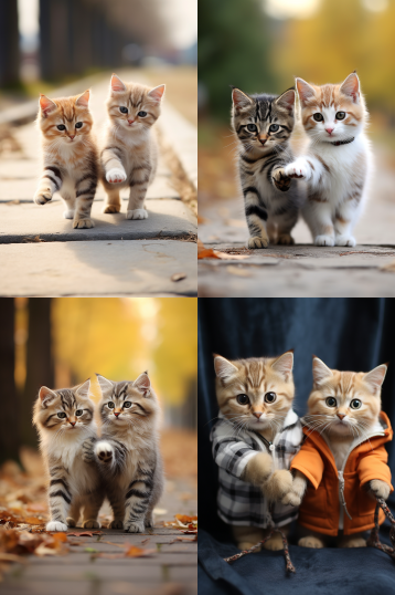 Midjourney Bot 更新时间:2023-09-04 11:52Two little cats holding hands --ar 2:3 --style raw --v 5.2