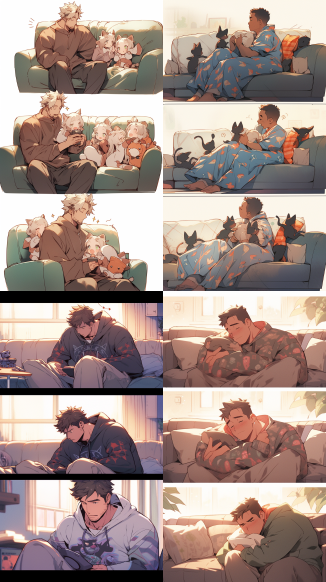 Midjourney Bot 更新时间:2023-09-04 11:50A man sits on the sofa, Disney animated style,comic strips,Pajamas ,comic strips,Pajamas --ar 9:16 --niji 5 --s 250