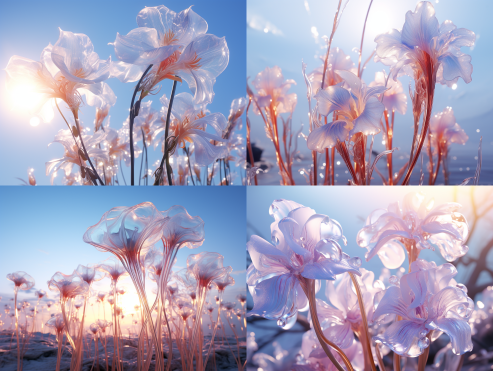 Midjourney Bot 更新时间:2023-09-04 11:55Digital flowers, iris flowers, roots composed of long and organic forms, frosted glass material, transparent plastic, backlit, flowers growing around, looking up, clean, sky, 3D art, C4D, super detailed --s 232 --c 12 --ar 4:3 --style raw --v 5.2