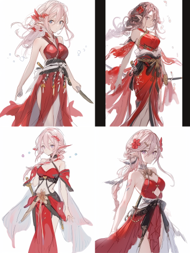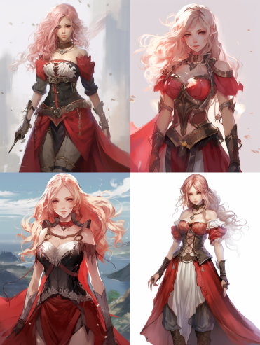 Midjourney Bot 更新时间:2023-09-04 12:00A woman high elf with red princess Vest and red fish tail skirt::10, Light pink Wavy hair, Blue eyes, Armed with a rapier,translucent cloak, Ethereal characters, Charming anime characters, With ethereal illustrations ,Dungeons and Dragons::6 --s 176 --iw 0.5 --ar 3:4 --style raw --v 5.2
