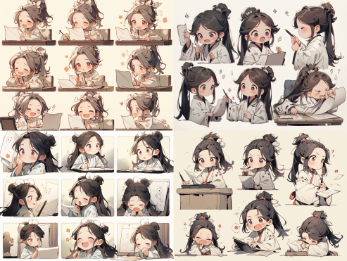 Midjourney Bot 更新时间:2023-09-04 11:56A little girl in a white robe reads, traditional clothes, animated character design, Chinese painting, light gray, cute, modest charm, emoticon package, 9 emoticons, emoticon Symbol table, multiple postures and expressions, anthropomorphic style, black strokes, different emotions, multiple poss and expressions, 8k --s 793 --ar 4:3 --style expressive --niji 5