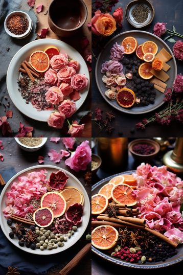 Midjourney Bot 更新时间:2023-09-04 11:50The raw materials for scented tea are on a plate, including dried roses, grapefruit slices, and mulberries --ar 2:3 --style raw --v 5.2