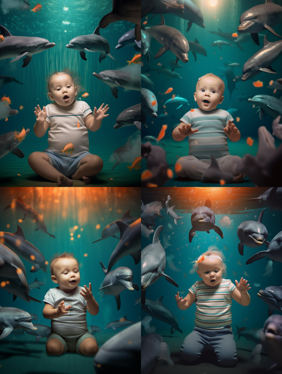 Midjourney Bot 更新时间:2023-09-01 12:51baby playing with dolphins under water underwater family photography by carolina, Laugh happily with your head up,in the style of dreamlike fantasy creatures, humorous caricature, digital airbrushing, expressive marks, playful expressions,dark teal and light orange, museum gallery dioramas, strong facial expression expansive skies art gary baseman cinematic shot quirky expressions, high detail --ar 3:4 --v 5.1 --iw 2