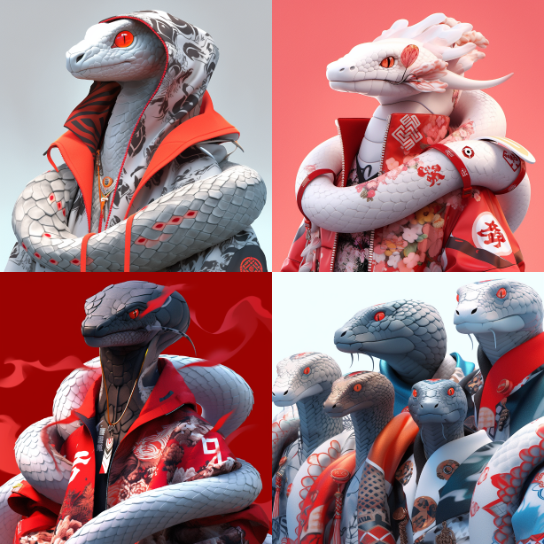 Midjourney Bot 更新时间:2023-09-01 12:39Chinese traditional zodiac signs, anthropomorphic snakes, exaggerated fashion clothing, trend accessories, realistic PVC textures, 3D art, 3D rendering, OC rendering, 3D models, blend rendering, NFT art, disruptive fiber art, color contrast and conflict, gray background, 32k, 3D characters, c4d --s 180 --ar 1:1 --niji 5