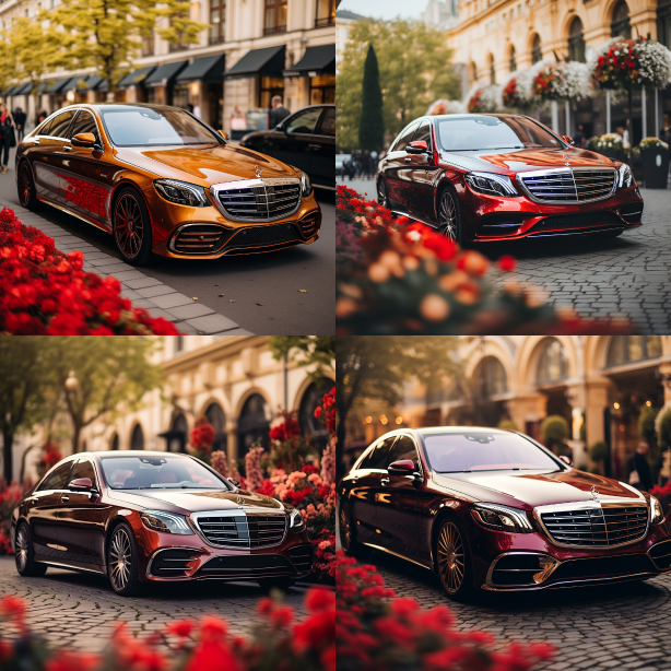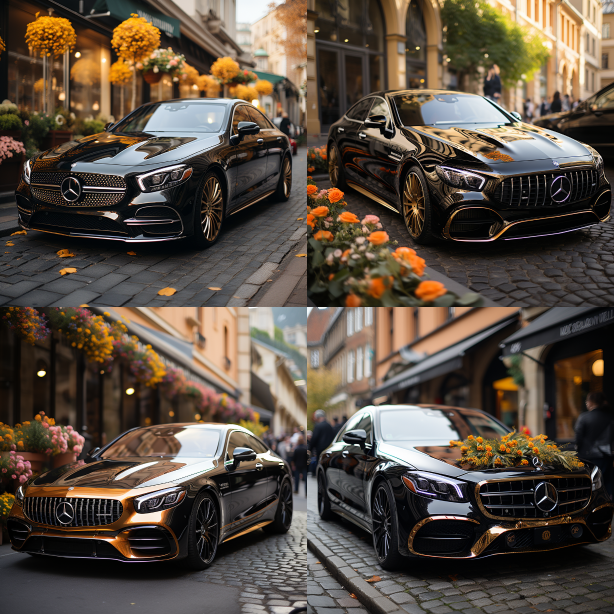 Midjourney Bot 更新时间:2023-09-01 12:44Masterpiece, high-quality, 8k, new Mercedes Benz S, float wedding car, bright black+gold border stickers, in a small town with many flowers, depth of field --ar 1:1 --style raw --v 5.2 --s 750