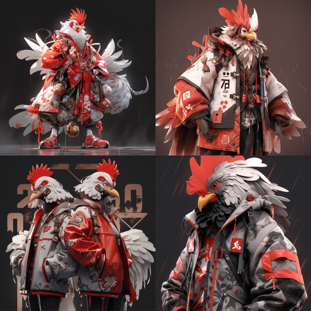 Midjourney Bot 更新时间:2023-09-01 12:43Chinese traditional zodiac, personified chicken, exaggerated fashion clothing, trendy accessories, realistic PVC textures, 3D art, 3D rendering, OC rendering, 3D models, blender rendering, NFT art, disruptive fiber art, color contrast and conflict, gray background, 32k, 3D characters, c4d --s 180 --ar 1:1 --niji 5