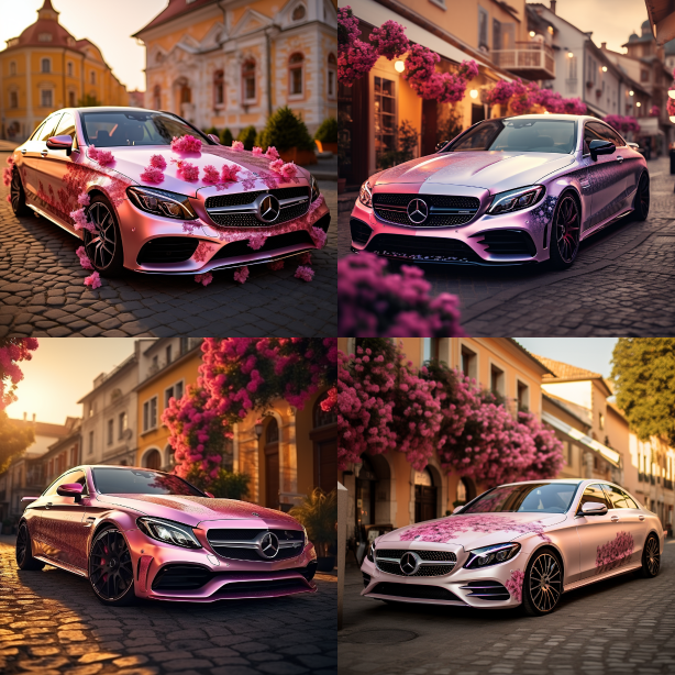 Midjourney Bot 更新时间:2023-09-01 12:40Masterpiece, high quality, 8k, new Mercedes Benz C, white+pink edge stickers, golden wheels, in a small town with very pink flowers, depth of field --ar 1:1 --style raw --v 5.2