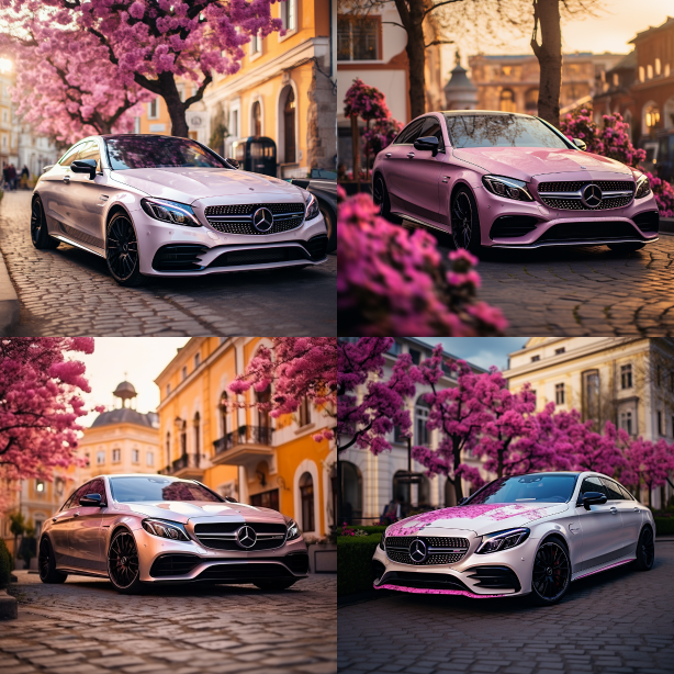 Midjourney Bot 更新时间:2023-09-01 12:36Masterpiece, high-quality, 8k, new Mercedes Benz C, white+pink edge stickers, golden wheels, in a small town with very pink flowers, depth of field,Ray Tracing Reflections --ar 1:1 --style raw --v 5.2