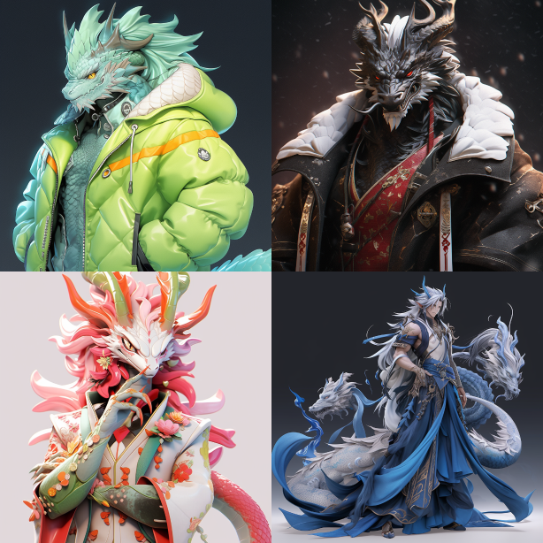Midjourney Bot 更新时间:2023-09-01 12:59Chinese traditional zodiac signs, anthropomorphic dragon figures, exaggerated fashion clothing, trendy accessories, realistic PVC textures, 3D art, 3D rendering, OC rendering, 3D models, blender rendering, NFT art, disruptive fiber art, color contrast and conflict, gray background, 32k --s 180 --c 5 --ar 1:1 --niji 5