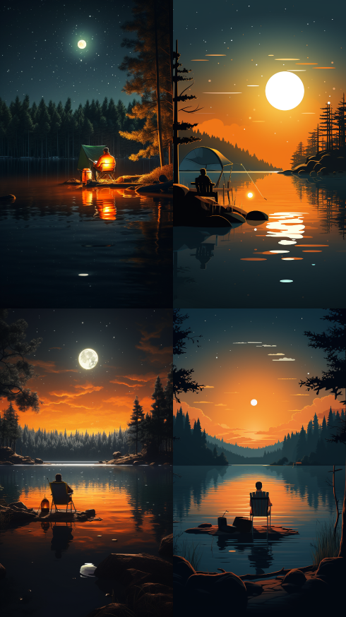 Midjourney Bot 更新时间:2023-09-01 12:08A fishing scene with a person sitting on a stool. At night, an orange camping light is placed next to the person, and the moonlight is reflected on the lake, surrounded by trees --ar 9:16 --style raw --v 5.2