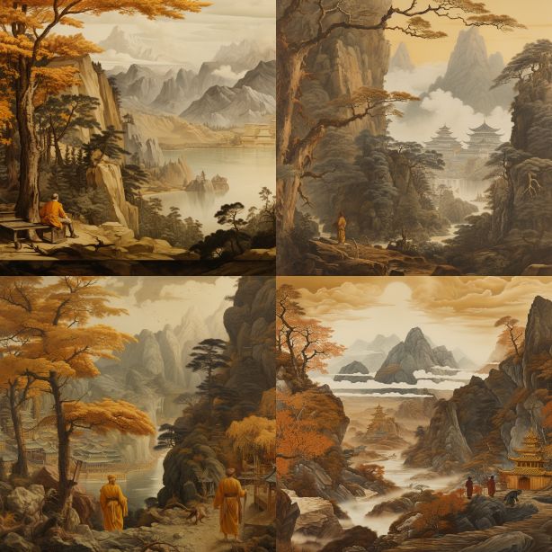 Midjourney Bot 更新时间:2023-09-01 12:01Painted a scroll of Chinese landscape in the mountains, in the style of tramp l ' œ Il illustrative detail, yellow and brown, Edward poynter, gold leaf, mysterious figures, monotonic context, romanticized reality --iw 2 --ar 1:1 --style raw --v 5.2