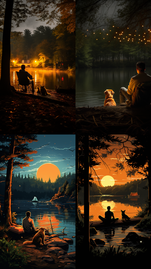 Midjourney Bot 更新时间:2023-09-01 12:13Nighttime fishing scene, real, with a person sitting next to a orange-colored lamp, surrounded by trees, and a dog lying nearby. --ar 9:16 --style raw --v 5.2