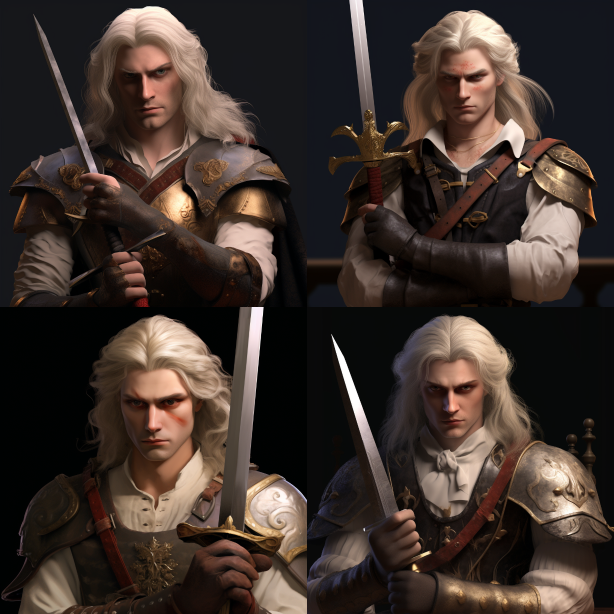Midjourney Bot 更新时间:2023-09-01 11:10A 20-year old young man, hairstyle like Lestat in the movie: Interview with the Vampire, long air, light blonde hair, holding a long knightly password in front of his chest, the password blade covered his right eye, wearing a 19th century Beau Brummell style shirt and dark blue vest, Victorian, character concept art, front, in focus, Wait Shot (WS) --ar 1:1 --style raw --v 5.2