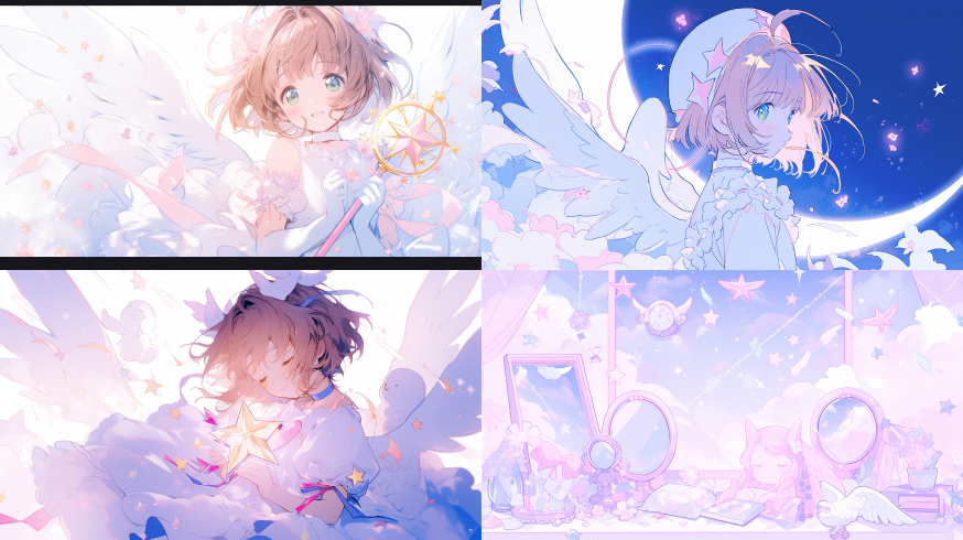 Midjourney Bot 更新时间:2023-09-01 11:07the picture is done in white and blue, in the style of Card Captor Sakura manga style, blink-and-you-miss-it detail,kawaii aesthetic, high-keyed palette, little star,precisionist art ,Dream colors,low saturation ,Lavender tones --ar 16:9 --niji 5