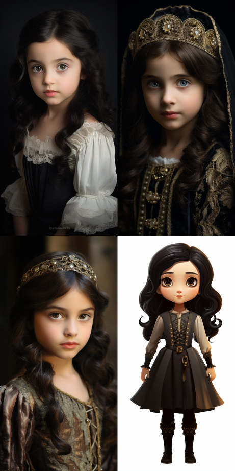 Midjourney Bot 更新时间:2023-09-01 11:10Middle Ages European Little Girl Princess with Black Hair and Black Eyes --ar 1:2 --style raw --v 5.2