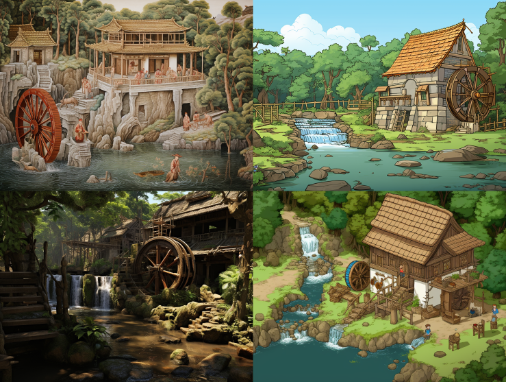 Midjourney Bot 更新时间:2023-09-01 10:46Outside the temple, there is a large water mill, next to which stands a princess, a maid, and two monks --ar 4:3 --style raw --v 5.2