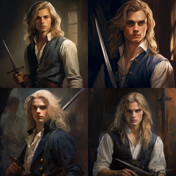 Midjourney Bot 更新时间:2023-09-01 10:49A 20-year-old young man, hairstyle like Lestat in the movie: Interview with the Vampire, longhair, light blonde hair, holding a long knightly sword in front of his chest, the sword blade blocked his left eye, wearing a 19th century Beau Brummell style shirt and dark blue vest, Victorian, character concept art, front, in focus, Waist Shot(WS) --ar 1:1 --v 5.2 --style raw