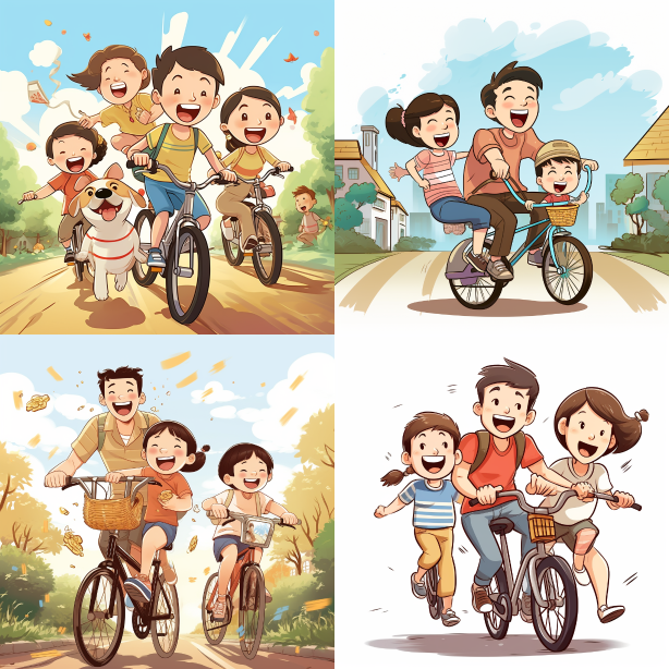 Midjourney Bot 更新时间:2023-09-01 10:08A happy family (father, mother, 3-year-old son riding a bicycle, father, mother, and son laughing happily), Chinese, cartoon --ar 1:1 --style raw --v 5.2