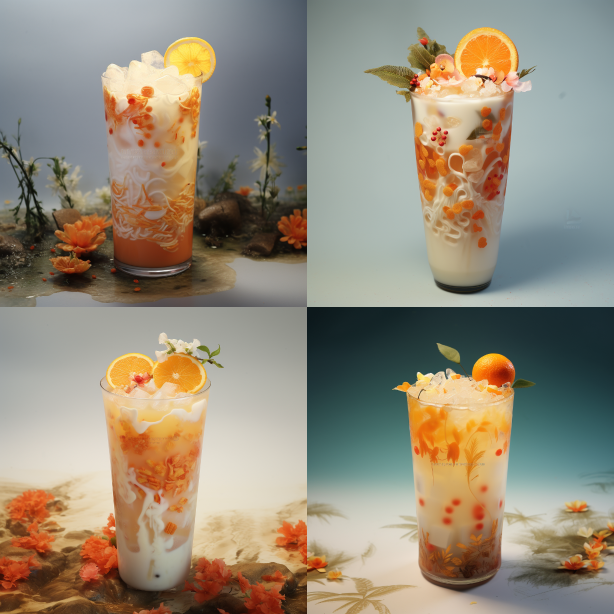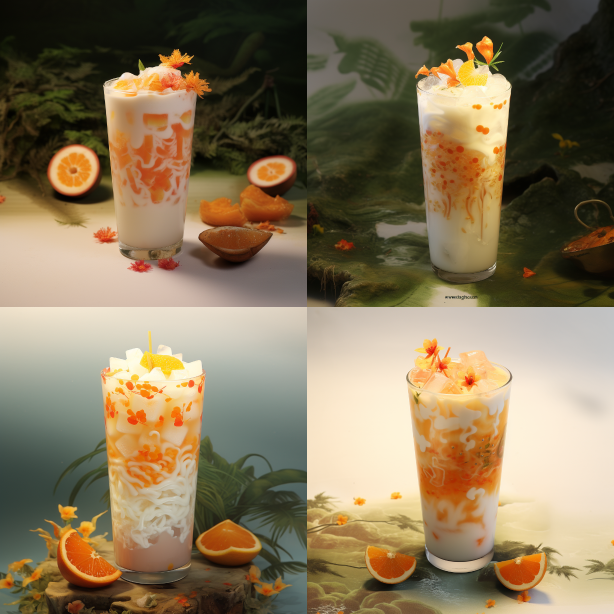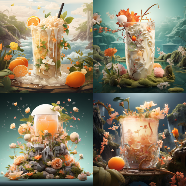 Midjourney Bot 更新时间:2023-09-01 10:00A cup of Yangzhi Ganlu milk tea, filled with flowers and plants from the forest landscape, surrounded by grapefruit, mangoes, and coconuts. Featuring a surreal fantasy style, captivating character illustrations, Vray rendering, rich and immersive nature, and outstanding atmosphere. --ar 1:1 --style raw --v 5.2