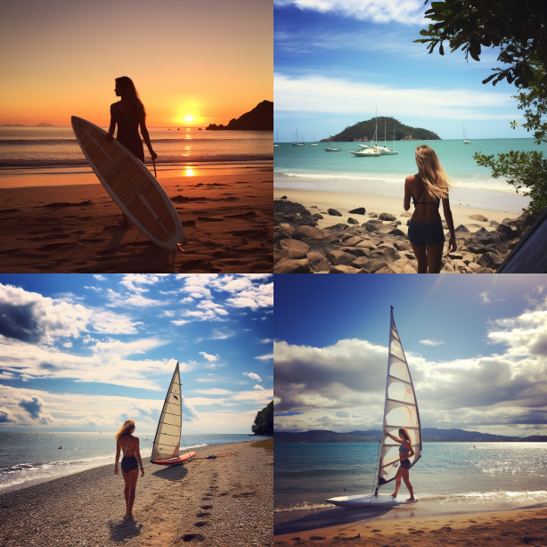 Midjourney Bot 更新时间:2023-09-01 10:04Beach Surfing Sailing Swimming Beauty by the Sea --ar 1:1 --style raw --v 5.2
