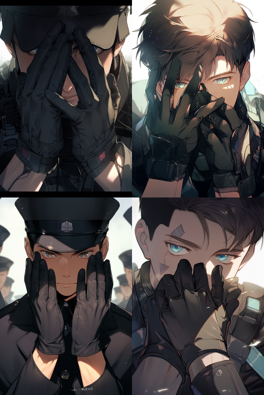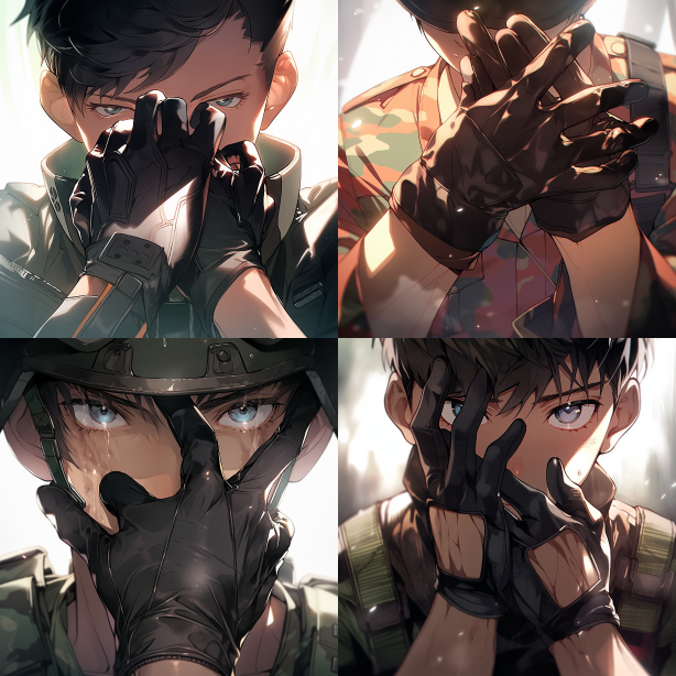 Midjourney Bot 更新时间:2023-09-01 01:12hands close-up, a 22 years old young manly male_soldier is wearing black_gloves, crew cut, Makoto Shinkai, in the style of 2D Japanese Anime, beautiful cinematic lighting, Official Art,Pixiv Fanbox, Digital Art, Epic Portraiture, Ultra Detailed, 32K Resolution, Vibrant Colors, Vivid Colors, Bright Colors, Masterpiece, Best Quality, Post Processing.. --s 80 --ar 1:1 --style original --niji 5