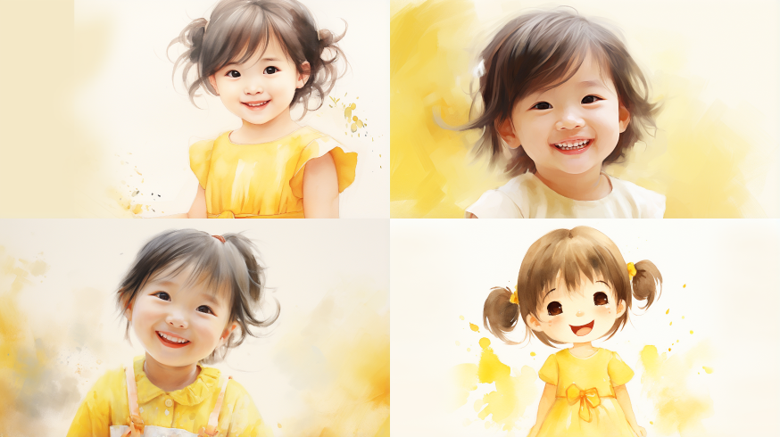 Midjourney Bot 更新时间:2023-09-01 00:38Simple watercolor painting of a 4-year-old girl wearing a yellow dress, with a happy smile. The background is a beige gradient. The picture is marked with the Chinese phrase "没事笑一笑" which translates to "Just smile for no reason". --ar 16:9 --style raw --v 5.2