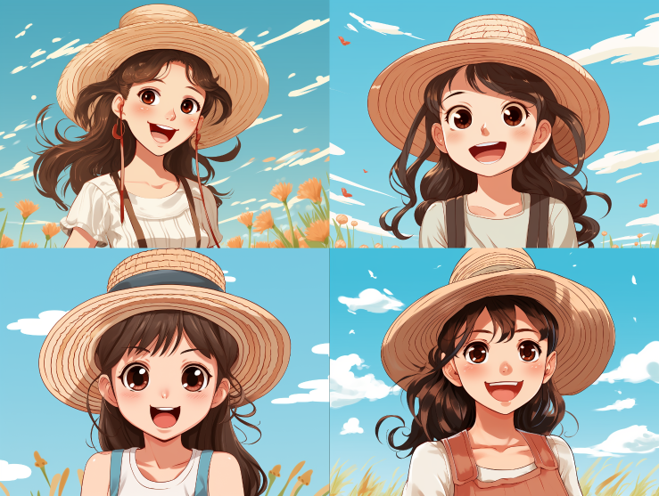 Midjourney Bot 更新时间:2023-09-01 00:49Simple illustration, a girl with a straw hat, double ponytails, happy smile, one handed comparison, light blue sky background --ar 4:3 --style raw --v 5.2 --s 750