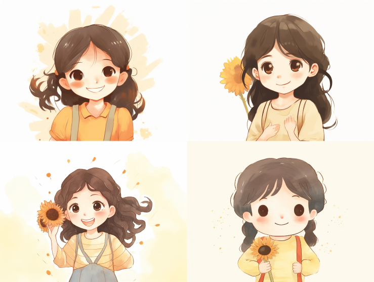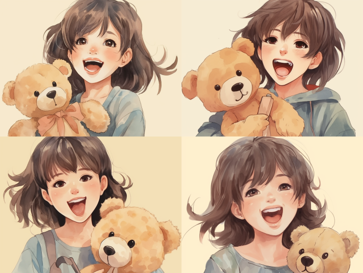 Midjourney Bot 更新时间:2023-09-01 00:31Simple watercolor painting, cartoon, a shoulder length short haired girl holding a teddy bear, laughing happily, with a beige background --no characters --ar 4:3 --style raw --v 5.2 --s 750