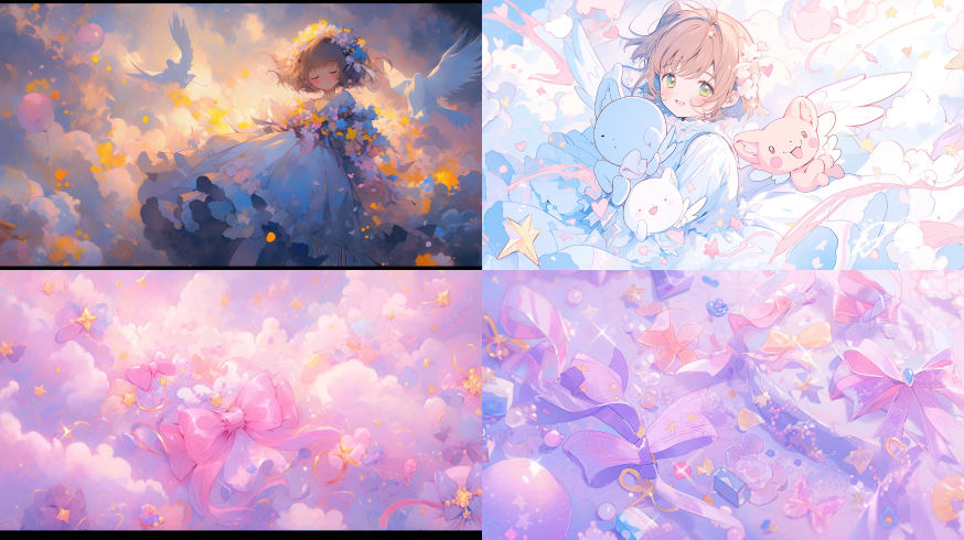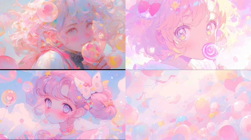 Midjourney Bot 更新时间:2023-09-01 01:01the picture is done in pink, in the style of Card Captor Sakura manga style, KINOMOTO SAKURA,bubbles,lollipop, blink-and-you-miss-it detail,kawaii aesthetic, high-keyed palette,precisionist art ,Dream colors,low saturation ,Pastel,oil painting , ,purple and yellow tones --ar 16:9 --niji 5