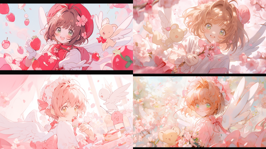 Midjourney Bot 更新时间:2023-09-01 01:02the picture is done in white, in the style of Card Captor Sakura manga style, KINOMOTO SAKURA,blink-and-you-miss-it detail,kawaii aesthetic, high-keyed palette,precisionist art ,Dream colors,low saturation ,Pastel,oil painting ,strawberry ,red and pink tones --ar 16:9 --niji 5