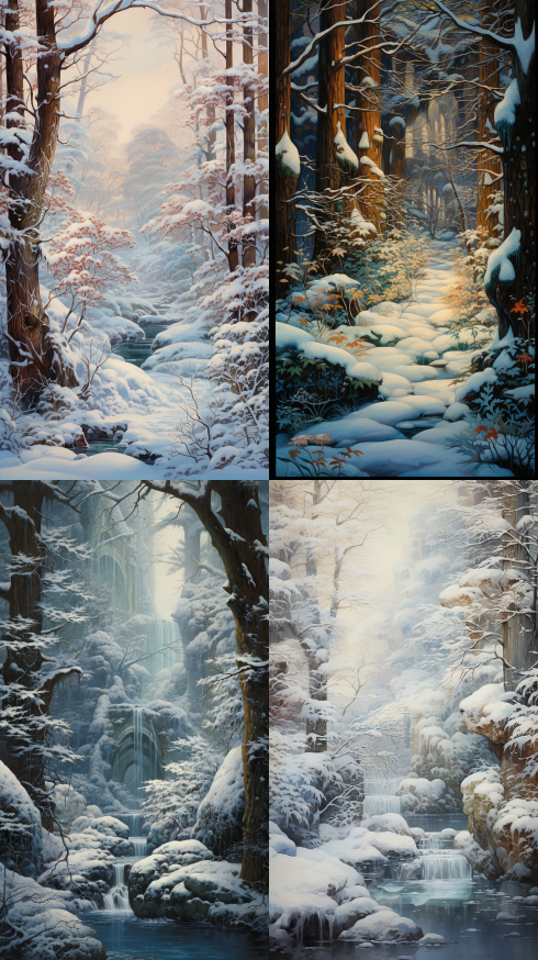 Midjourney Bot 更新时间:2023-09-01 01:08In the magical forest of winter, it snowed heavily, and to the left was a high snowy mountain,,Sam Guay,Enchanted garden --ar 9:16 --style raw --v 5.2