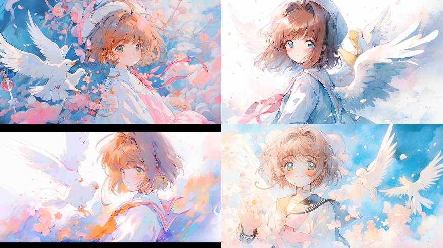 Midjourney Bot 更新时间:2023-09-01 00:28the picture is done in white , in the style of Card Captor Sakura manga style by CLAMP, blink-and-you-miss-it detail,kawaii aesthetic, high-keyed palette, blue school uniform,precisionist art ,Dream colors,low saturation,dark background, Watercolor paint,Pastel,oil painting --ar 16:9 --niji 5