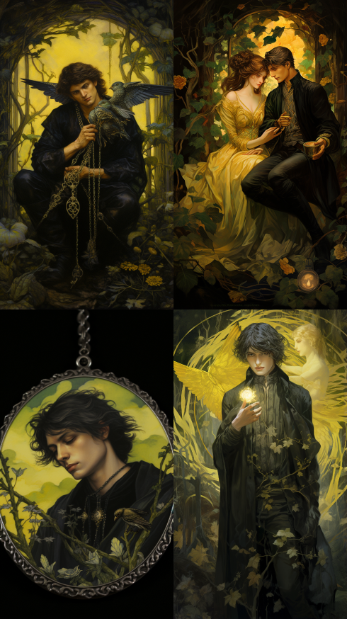 Midjourney Bot 更新时间:2023-09-01 01:02A young man with black wings gave a witch in yellow a "green pendant necklace",Sam Guay,Enchanted garden --ar 9:16 --style raw --v 5.2