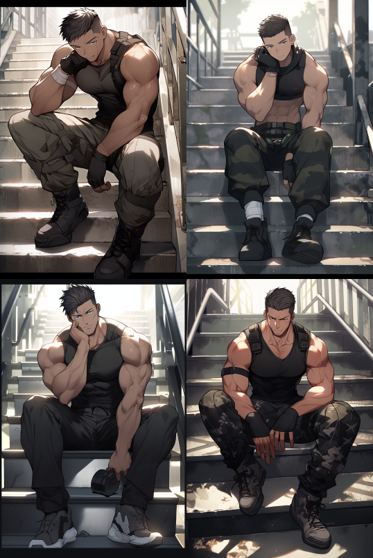 Midjourney Bot 更新时间:2023-08-31 23:12Frontal view,fullbody,a 25 years old young handsome topless_male is sitting on the stairs,crew cut,perfect face,trim physique,athletic build,pectorals and abdominals,he is wearing black_gloves,trousers,military_boots,topless,no shirts,without shirts,none shirts,city background,beautiful cinematic lighting,Detailed,32K Resolution,Vibrant Colors,Vivid Colors,Bright Colors,Masterpiece,Best Quality,Post Processing. --ar 2:3 --style original --niji 5