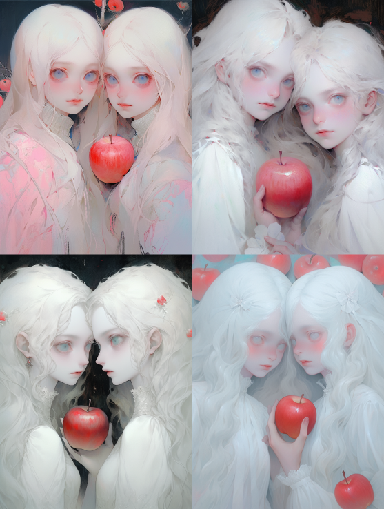 Midjourney Bot 更新时间:2023-08-31 22:26Two girl with red apples, white long hair, blue eyes, The makeup of the doll, with a matte texture and transparent colors, Imitate Hiromu Arakawa's painting style, Dream colors, delete skin texture, low capture, Dream colors, low capture, Dream colors, Loish style, Acrylic paint, Matte, surrealism, pink tones --s 96 --ar 3:4 --niji 5