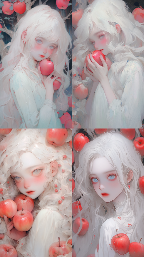 Midjourney Bot 更新时间:2023-08-31 22:17The girl with red apples, white long hair, blue eyes, The makeup of the doll, with a matte texture and transparent colors, Imitate Hiromu Arakawa's painting style, Dream colors, delete skin texture, low capture, Dream colors, low capture, Dream colors, Loish style, Acrylic paint, Matte, surrealism, pink tones --s 96 --ar 9:16 --niji 5