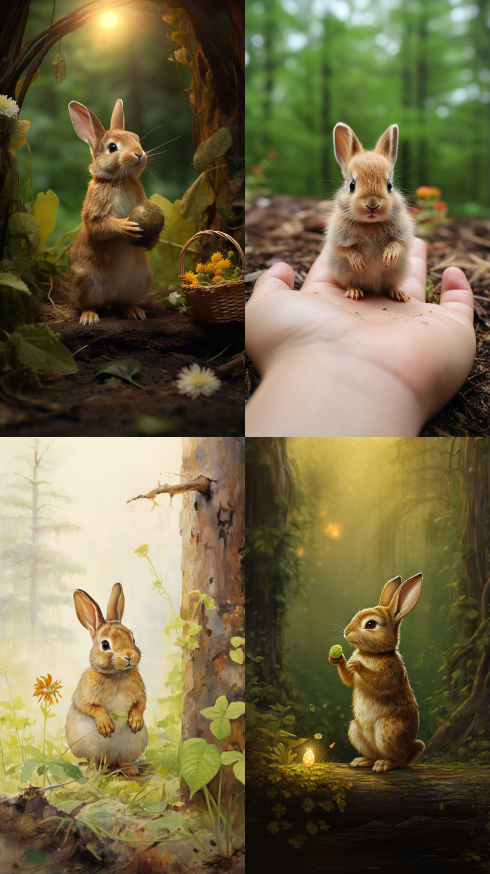 Midjourney Bot 更新时间:2023-08-31 23:09A little rabbit with a small nut in its hand wants to return to its rabbit nest. It goes to find something to eat for the baby rabbit,,Sam Guay,Enchanted garden,Wide view,Full body,Subjective view --ar 9:16 --style raw --v 5.2